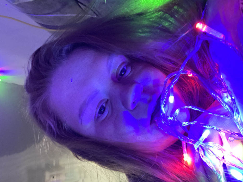 A woman's face is illuminated by blue, red, and green lights. String lights are wrapped around her mouth and chin. She has long, reddish-brown hair. The background includes what appears to be a wall and ceiling, also lit in various colors. The overall impression is one of vibrant, playful, and unconventional lighting.
