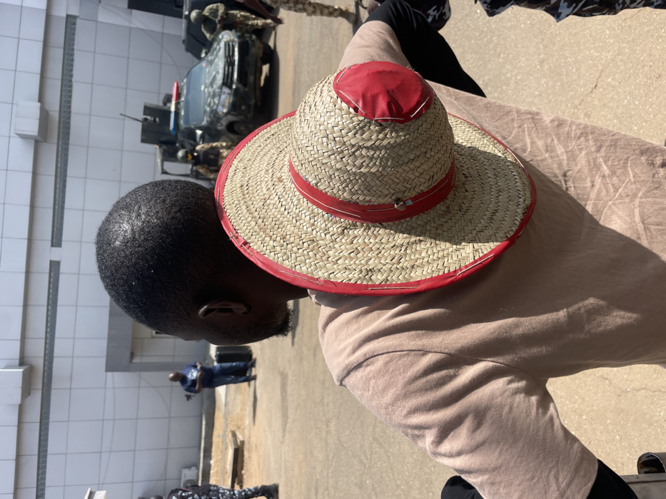 The image depicts an outdoor scene in the city of Kwi, Nigeria, characterized by a bright, sunny day. In the immediate foreground, the back of a dark-skinned individual's head and upper torso are visible, facing away from the camera. This individual has short, dark hair and is wearing a light brown or tan short-sleeved t-shirt. A woven straw hat, featuring a wide brim and a round crown, both outlined with red fabric trim, is resting on the individual's back, draped over their left shoulder. In the midground, an asphalt or concrete surface extends, leading to a modern building in the background with light-colored paneling and horizontal window or vent structures. Several other individuals are present in the midground. To the left, a person in a dark uniform is partially visible. Further back and slightly to the left of the center, a male subject in a blue shirt and dark trousers stands, possibly holding an object. To the right of the central axis, a dark-colored pickup truck is parked, equipped with a visible weapon system (possibly a turret or machine gun) mounted on its bed, and emergency lights (blue and red) on its roof. Surrounding the vehicle are multiple individuals in camouflage military or security uniforms, some holding long firearms. The environment suggests an institutional or controlled outdoor area with a noticeable security presence.