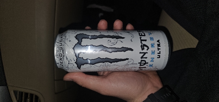 An overhead-angle image captures a human hand holding an aluminum energy drink can within a dimly lit vehicle interior