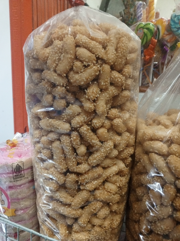 The scene, located in the city of Batheay, Cambodia, captures a close-up view of a retail snack display. The primary subject is a tall, clear plastic bag, sealed at the top with a red twist tie, densely packed with numerous light brown, cylindrical snacks heavily coated in white sesame seeds. To the right, a portion of another identical clear plastic bag, also filled with these sesame snacks, is visible. At the bottom left, a pink-wrapped package of rectangular layered snacks is present on a metallic shelf. This package displays a white 'HALAL' logo and text that includes 'Berat Bersih: 170g' and the phrase 'IN INDONESIA', indicating its origin or market association. The background features an orange corrugated surface on the left and a blurred arrangement of colorful lollipops of various shapes and colors on the right, consistent with a candy or snack section. No individuals are depicted in the frame.