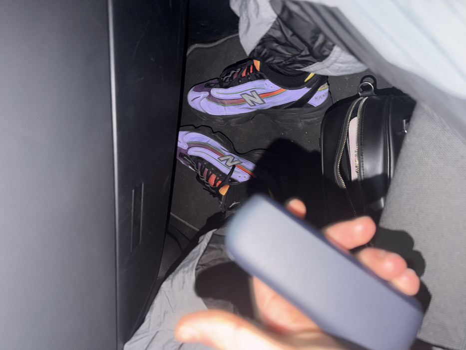 The image captures a first-person view inside a vehicle in Pernik, Bulgaria. The lower body of an occupant is visible, showing a left hand holding a dark blue/grey rectangular electronic device. The individual wears light grey trousers and two New Balance 2002R athletic shoes, notable for their reflective purple/lavender upper, orange accents, black soles, and green 'N' logo. A small, partially unzipped black leather-like bag rests on the dark floor mat between the feet. The dark grey dashboard or glove compartment is visible in the background. The scene is dimly lit.