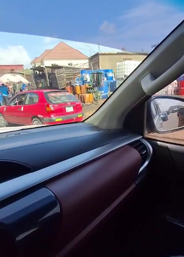 view from inside a vehicle driving down a road in a bustling area. Through the windshield, a variety of scenes unfold. Initially, there's a cluster of colorful barrels and containers, along with some makeshift structures. A red car is parked nearby. As the vehicle moves forward, the view shifts to show people walking around and a pink umbrella. Later, the scene transitions to a roadside with people dressed in a variety of clothing, some standing near a black car with its trunk open. The environment is a mix of buildings, stalls, and vehicles, indicating a busy commercial or residential area. The sky is a clear blue.