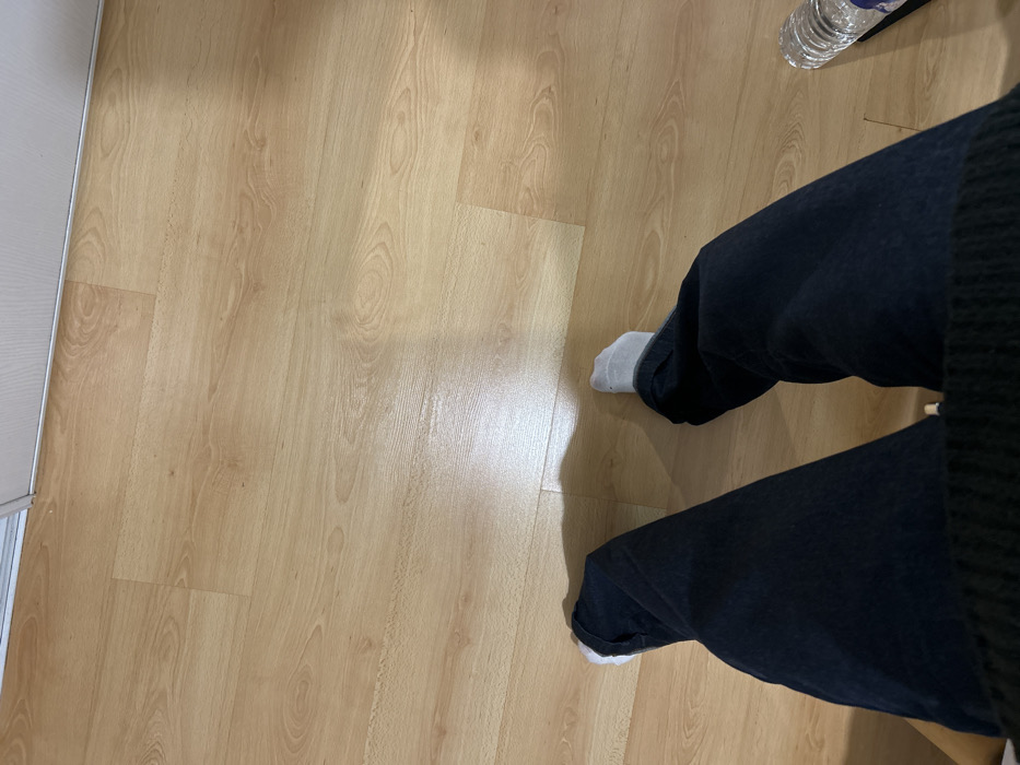A top-down view shows a person sitting on a light brown wooden floor, wearing dark-colored pants and white socks. A partially visible water bottle is near the top right. The left side of the frame features a blurred white wall or cabinet. The lighting creates a bright reflection on the floor.