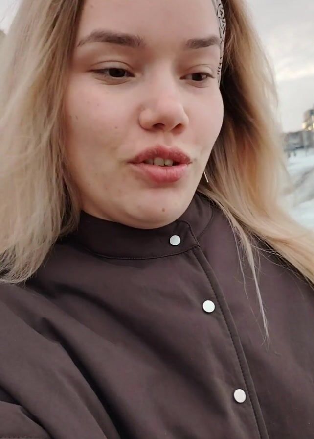 A young woman with long blonde hair is recording a selfie video outdoors. She wears a light-colored patterned headband and a brown jacket with several white buttons. The woman has a fair complexion and her face is partially obscured by her hair. She is smiling and speaking into the camera, stating she is going to her sister's house, who is probably still sleeping, and that she intends to surprise her. A large snowbank is visible behind her. A building is visible in the background. The weather appears overcast.