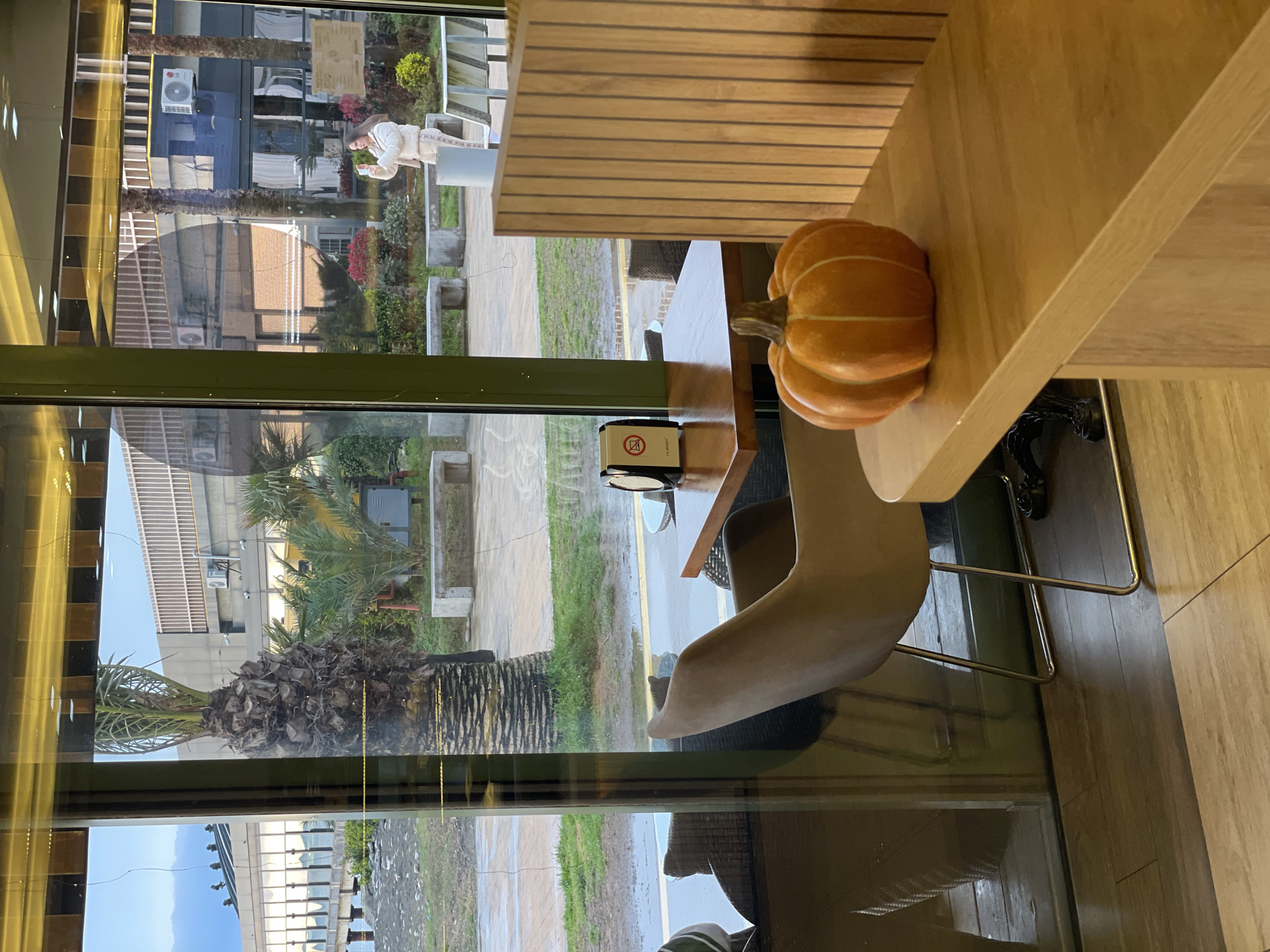 n indoor setting with a view through a large window. Inside, there is a wooden table and chair. A small orange pumpkin is on the table. Outside, the view includes trees, grass, and buildings. In the distance, a person in a white outfit is visible. The location appears to be Batumi, Georgia, based on the architecture and landscape.