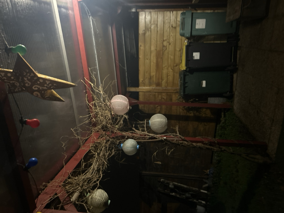 An outdoor space features a metal star and string lights against a translucent wall. Dried branches intertwined with illuminated paper lanterns create a whimsical focal point. Stacked utility boxes are visible near a wooden wall. Beneath the lantern display, ladders and other unseen items are placed. Grass grows in a strip down the right side. Lighting suggests the scene is illuminated at dusk or night.