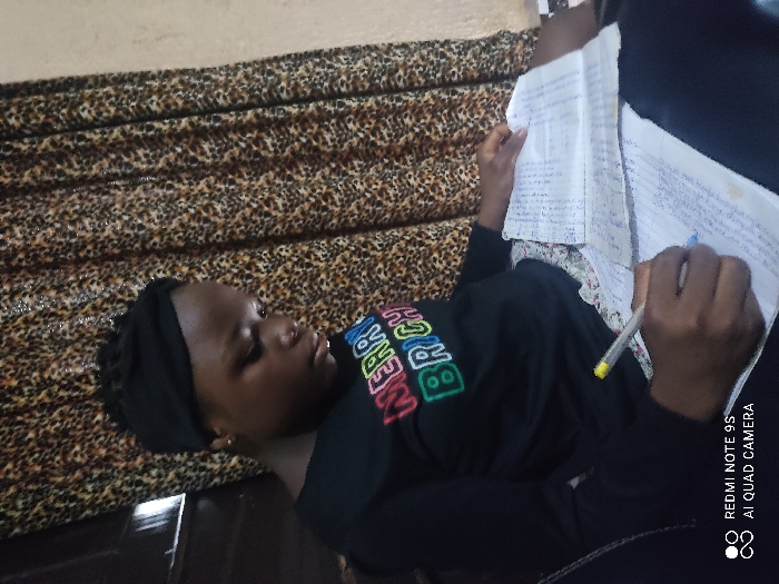 An individual, appearing to be a young female with a dark complexion, is depicted from the mid-torso up, seated indoors in Onitsha, Nigeria