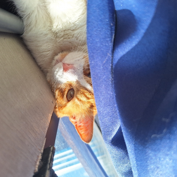 The image captures a domestic cat, an orange and white tabby, positioned in an indoor setting within the city of Unknown, Unknown. The cat's head and upper torso are visible, featuring prominent orange tabby stripes on its head and ears, contrasting with white fur on its face, chin, and chest. The cat's left eye (viewer's right) is fully visible with an amber iris, while its right eye is partially obscured by a section of deep blue fabric occupying the left side of the frame. The cat's pink nose is central to its face, and its head is slightly tilted, directing its gaze forward. To the immediate right of the cat, a vertical, light-colored wooden or laminate panel is present. Above this panel and behind the cat's head, a dark, rigid, possibly metallic, structural element is partially visible. The background reveals a brightly lit window featuring horizontal blinds or slats, indicating a sunny outdoor environment. Strong natural light bathes the scene, creating bright highlights on the cat's fur and the blue fabric.