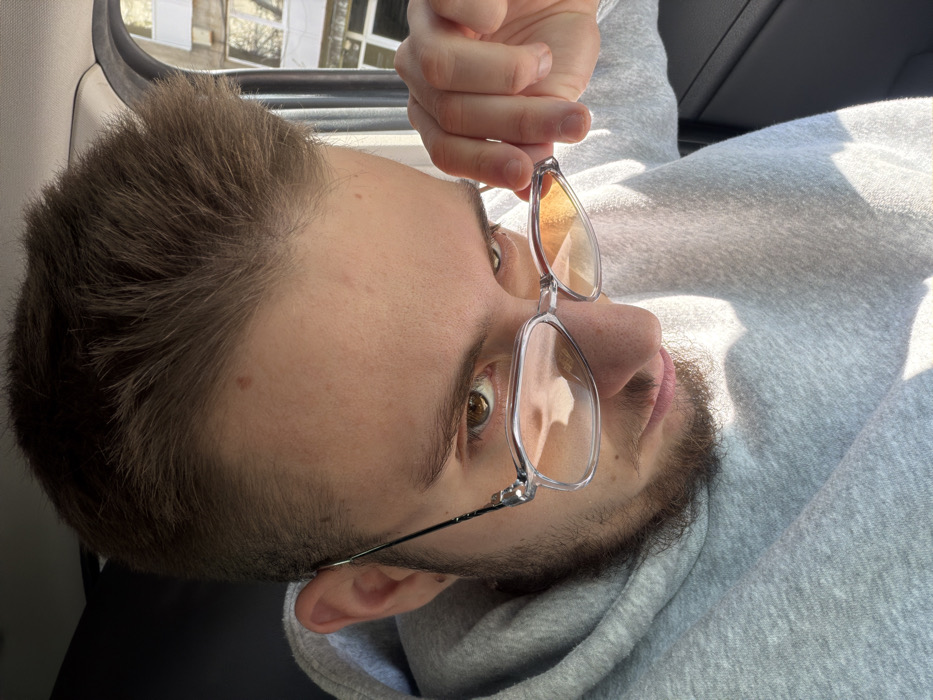 A close-up image depicts a single young adult male with brown hair and light facial stubble, seen from a slightly elevated and angled perspective. He wears a light grey hooded sweatshirt. His brown eyes are directed forward, looking over the top of clear-framed glasses with amber-tinted lenses, which he holds partially lowered with his right hand. Direct sunlight illuminates the left side of his face and upper body, creating strong highlights and shadows. The subject is situated within what appears to be the interior of a vehicle, with dark interior elements visible on either side of his head. Through a vehicle window in the upper right background, a light-colored, multi-story urban building with multiple windows is visible under daylight conditions. The architectural style is consistent with urban environments in Bulgaria. The image does not contain specific identifying landmarks to determine a precise location within the city of Radomir, Bulgaria, beyond an urban setting.