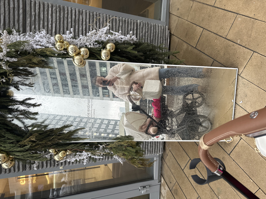 An outdoor scene in Khimki, Russia, captures a vertical, rectangular full-length mirror standing on light-brown tiled pavement. The mirror is framed by an evergreen garland adorned with multiple gold spherical ornaments and frosted white artificial foliage, indicating winter holiday decor. Reflected in the mirror is a female subject, visible from approximately the waist up, wearing a light-colored faux fur coat and blue jeans, holding a smartphone to take a self-portrait. She carries a white, structured handbag with a gold chain strap. The woman is positioned behind a dark-colored baby stroller with a light-colored canopy, inside which pink and red items are visible, partially obscuring a child. The reflection also includes several tall, modern multi-story buildings and Cyrillic text on the mirror's surface. In the immediate foreground, the brown leather-wrapped handle of a stroller with an attached black cup holder is visible. The surrounding environment includes sections of a building facade with textured grey panels and large glass windows or doors, with partial English text "eli" or "eil" visible through a window on the left.