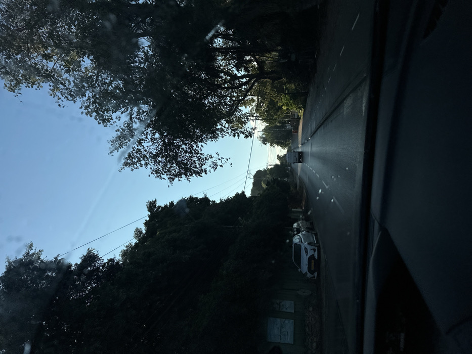 A road stretches into the distance, lined with trees and foliage. A parked car is visible on the right side. The sky peeks through the canopy of trees on the left. A vehicle is visible in the distance on the road. The image is captured from inside a car. The right side of the frame is dominated by the car's interior.