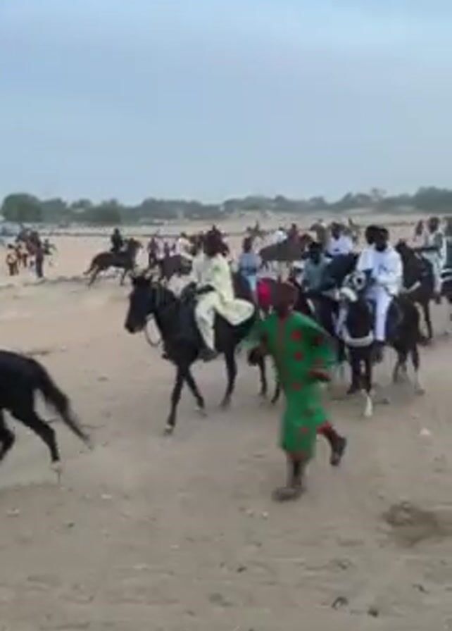 large group of people on horseback in a sandy, open area. Many of the riders are wearing casual clothing, with some in more traditional attire, like a white robe. The horses are of various colors, mostly dark shades like black and brown. Some riders wear helmets or hats. A person in a green outfit is running alongside the group. In the background, more people and horses are visible, indicating a gathering or event. The sky is overcast, suggesting a dull or cloudy day. The ground appears sandy or dusty. The overall scene conveys a sense of movement and activity, potentially part of a parade or ceremonial procession.