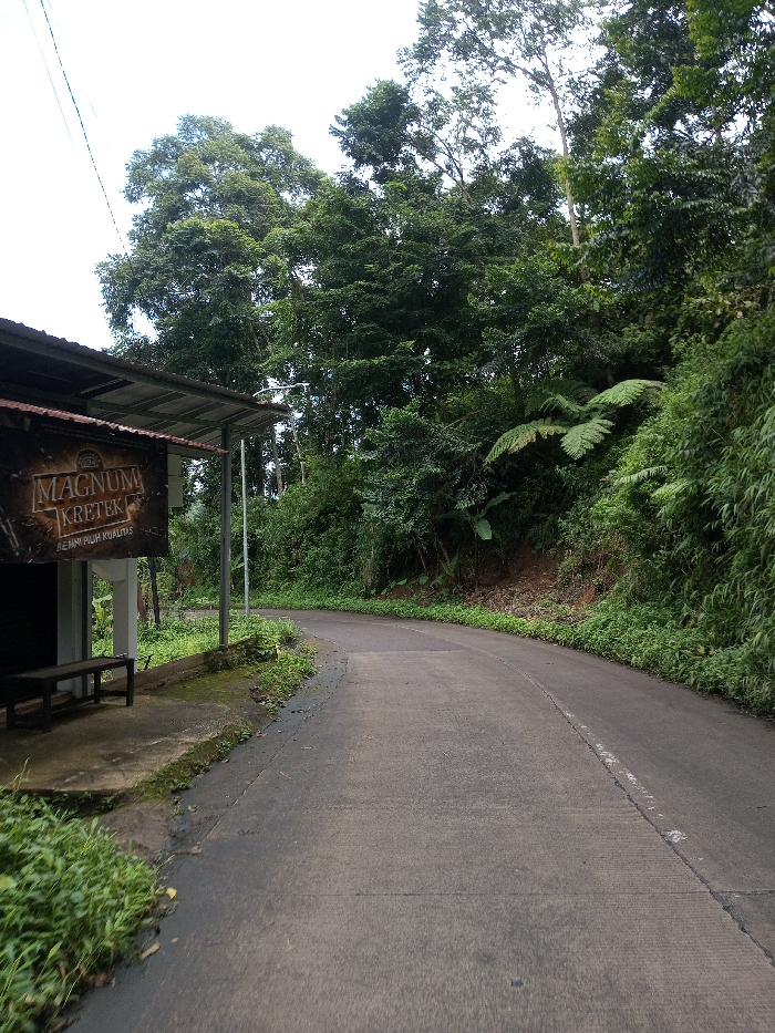 The image displays a paved road curving to the right and slightly uphill, bordered by lush green vegetation. On the left, a structure with a dark corrugated metal roof features a banner displaying "MAGNUM KRETEK" in large golden letters with "BENIH PILIH KUALITAS" below. A dark wooden bench rests on a concrete platform directly below the banner. The area surrounding the structure and along the road's edge is overgrown with moss and various green plants. To the right of the road, a steep, densely vegetated embankment rises, covered in numerous trees, shrubs, and prominent fern fronds. Utility lines are visible in the upper left portion of the frame. The sky is overcast and partially obscured by the dense tree canopy. No people are present. Based on the Indonesian text "MAGNUM KRETEK" and "BENIH PILIH KUALITAS" on the banner, this location is identified as likely being in Indonesia, not Ariyalai, Sri Lanka.