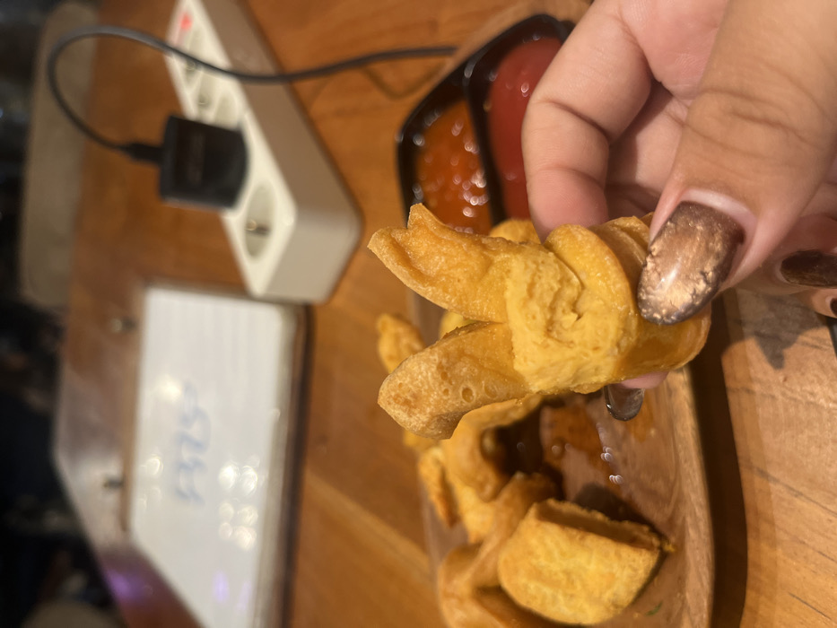 The scene depicts a close-up view of a person holding a fried food item at a wooden table in Kerambitan, Indonesia. A dark-skinned hand, exhibiting fingernails with a metallic, multi-toned polish, holds a single golden-brown, irregularly shaped fried dough item that appears twisted or knotted. On a circular wooden plate to the left, several additional pieces of the same fried food are present, some displaying oily residue. To the right of the held item, a black compartmentalized dish contains two distinct red dipping sauces: one is a brighter, textured chili sauce, and the other is a darker, smoother red sauce. In the blurred background, a white multi-socket power strip with three outlets is visible on the right, with a black charger block plugged into one outlet and its cable extending upwards. A blurred white rectangular object, possibly a menu or tablet with indistinct blue markings, rests on the table to the left.