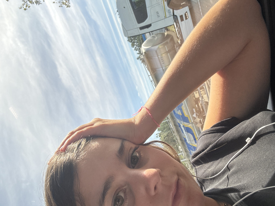 The image presents a close-up, selfie-style shot of an individual in an outdoor, industrial-leaning setting within Leiria, Portugal, under bright daylight. **Person:** A single individual, appearing female, occupies the foreground. Their face, featuring brown hair and dark eyes, looks directly at the camera with a neutral expression. The right arm, displaying a tanned complexion and a pink string bracelet on the wrist, is bent, with the hand partially supporting the head. The individual wears a dark, ribbed top and white wired earbuds, with the cable visible across their chest. **Subjects/Objects (Background):** The background reveals a bright blue sky with scattered white, wispy clouds. High in the sky, a faint grid of bright artificial lights is visible. Directly behind the individual, a large blue and yellow industrial structure or barrier is prominent, clearly displaying the "Cimentos Asland" logo. Adjacent to this, parked heavy vehicles include the cab of a white truck, marked "3720", and a silver cylindrical tanker trailer, labeled "4549". Below the vehicles, various stacked materials, possibly wood or construction beams, are visible. Green foliage from distant trees lines the far right background. **Actions/Interactions:** The individual is posing for a photograph, with their head resting on their hand, while seemingly listening to audio via earbuds. No other individuals or direct interactions are depicted. **Environment:** The scene is illuminated by strong, direct sunlight, indicating clear weather. The presence of large trucks, a tanker trailer, and an industrial structure with a cement company logo indicates an active transport or industrial zone.