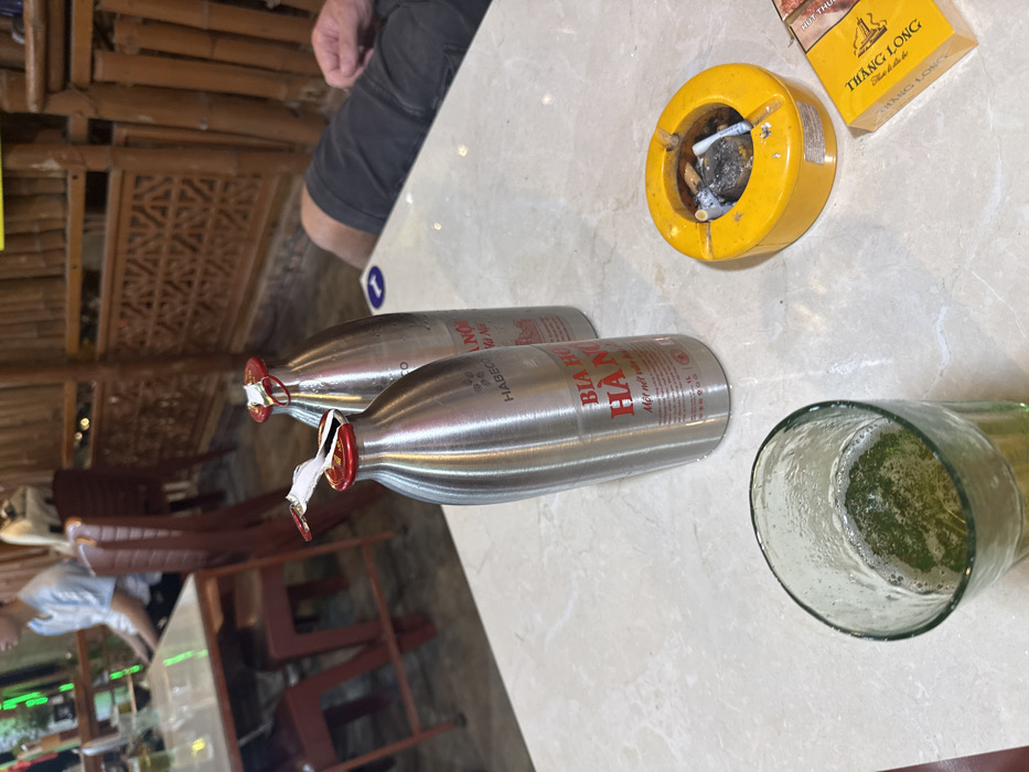 The scene depicts a casual dining or drinking establishment in Nha Trang, Vietnam. On a light-colored, possibly marble, tabletop in the foreground, two metallic 1-liter bottles of "BIA HƠI HÀ NỘI" are present. Both bottles have red caps and are uncapped, with the front bottle containing a white paper object, possibly a napkin or tissue, inserted into its neck. To the lower left, a glass contains a green-tinted, foamy liquid, consistent with beer, and exhibits condensation on its exterior. To the right of the bottles, a yellow circular ashtray holds multiple cigarette butts and ash. Adjacent to the ashtray lies a sealed yellow pack of "THĂNG LONG" brand cigarettes. A person's lower right leg and a portion of their arm, clothed in dark shorts, are visible on the right side of the main table. In the blurred background, another individual wearing a light-colored t-shirt is seated at a separate table. The establishment's interior features wooden or bamboo lattice partitions forming the background wall, suggesting an open-air or semi-outdoor setting.