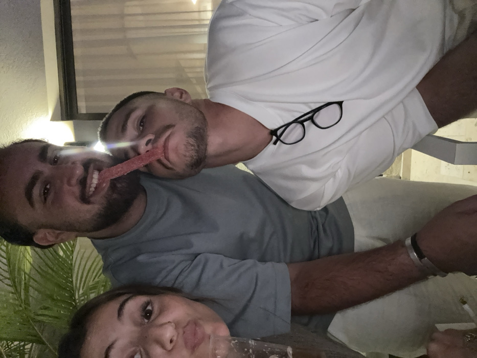 An evening photograph depicts three individuals in a casual setting in Rishon LeZion, Israel. The scene is illuminated by artificial light, suggesting an evening or nighttime context. On the left, a female subject is partially visible, featuring dark hair, a nose ring on her left nostril, and a puckered lip expression. Her left hand, adorned with a ring, holds a clear plastic cup containing a beverage. In the center stands a male subject with dark hair and a beard, looking directly at the camera with a smile. He wears a light blue/grey short-sleeved t-shirt and light-colored bottoms. A red, sugar-coated, elongated candy is held in his mouth, protruding from the right side. His left arm is visible, showing a silver bracelet and a black band. On the right, a second male subject is visible from the chest up, with short dark hair and a mustache. He wears a white short-sleeved t-shirt, with black-framed eyeglasses tucked into its collar. The red candy from the central male extends upwards, positioned in contact with his right nostril. The background includes dark green foliage, consistent with palm fronds, on the left. On the right, a dark window or door frame with internal illumination is visible, suggesting a building interior adjacent to an outdoor or semi-outdoor patio environment.