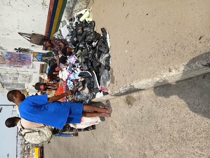 The image displays an outdoor street market scene in Ikeja, Nigeria, under bright daylight conditions, evidenced by strong shadows cast on the concrete ground. In the foreground, a person wearing a blue t-shirt and matching blue shorts stands with their back largely to the viewer, leaning forward and looking down at a large, scattered pile of footwear. This merchandise, consisting of various shoes, sandals, and slippers, some individually wrapped in clear plastic, is displayed directly on the paved ground surface, adjacent to a concrete curb. The footwear is predominantly dark in color, with some lighter-colored items visible. To the right of the footwear display, a female vendor is seated directly on the ground, leaning against a whitewashed concrete wall. She wears a patterned top and looks directly towards the camera with a slight smile. A brown shoulder bag hangs on the wall above and behind her. The concrete wall extends across the mid-ground, showing signs of wear with dirt and peeling paint. A horizontal stripe of blue, yellow, and green paint runs along the lower section of the wall. Multiple posters and flyers, some partially torn, are affixed to the upper portion of the wall, displaying various graphics and text. A painted graphic resembling a palm tree is also visible on the wall. Further to the left in the mid-ground, a person wearing a light-colored shirt and a striped backpack walks away from the camera on the sidewalk. Beyond them, a yellow vehicle is visible on a paved road, and overhead streetlights are discernible in the distance. Another individual is seen further along the wall, bending over a display of red produce, consistent with tomatoes.
