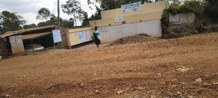 The scene depicts an unpaved, reddish-brown dirt road or open area in Borabu Chitago ward, Kenya, under an overcast sky