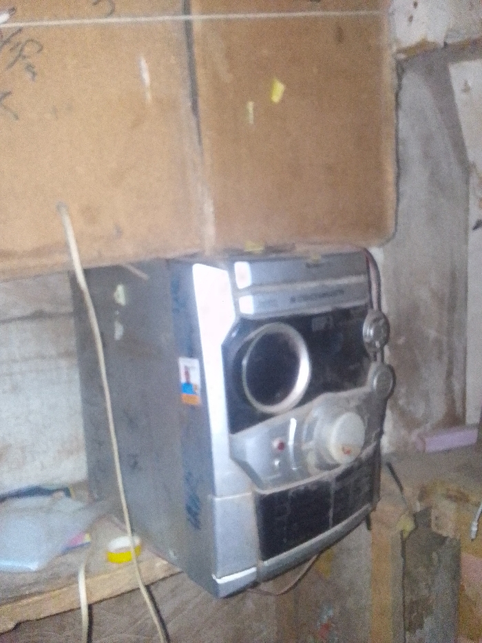 - "A dusty, silver Panasonic stereo system sits below two cardboard boxes" by FM-64O1h2, licensed under CC BY 4.0