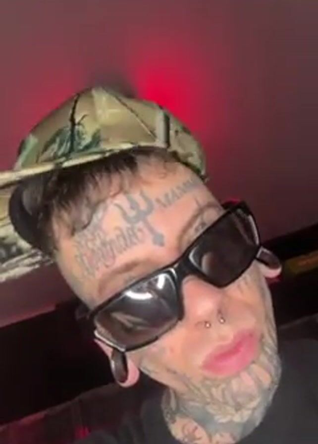 A person with numerous face and neck tattoos, wearing sunglasses and a camo hat, and a black t-shirt with a drawing on it, poses in front of the camera