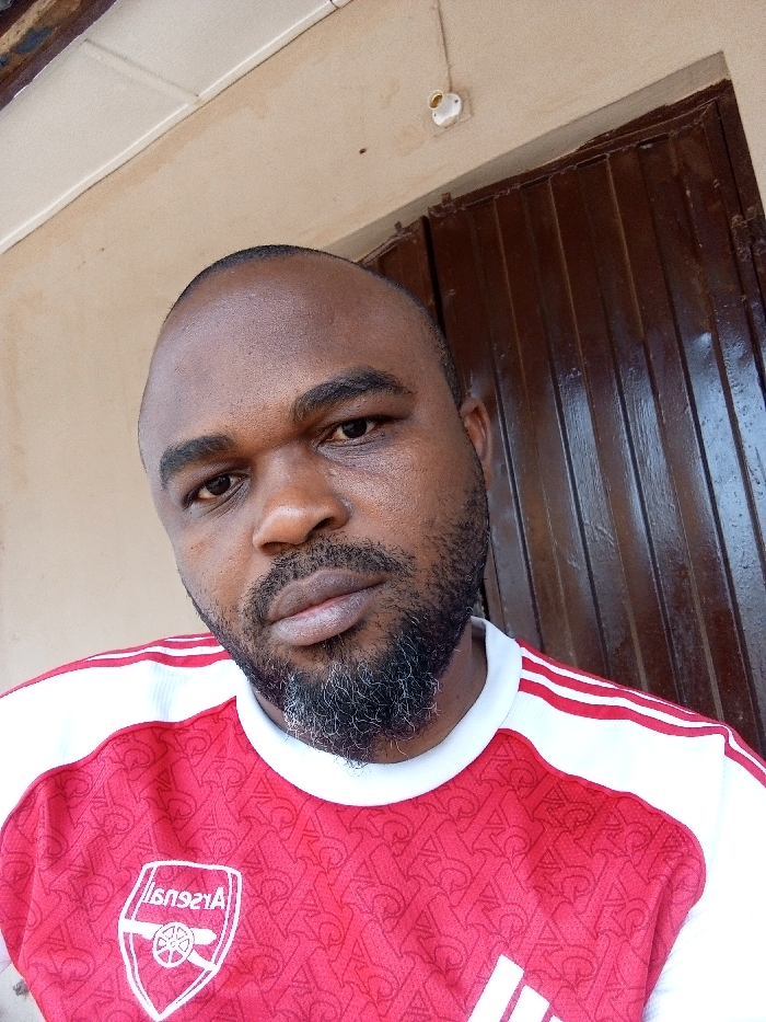 The image captures an adult male, likely in Sabon Tasha, Nigeria, positioned against an outdoor or semi-outdoor background