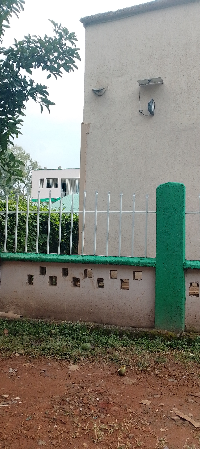 An eye-level shot shows a light brown building, featuring a security light and eaves. In front of it stands a fence with a green base and painted pillars, and a silver picket section. The base has spaced, square cut-outs. A taller building is visible in the background. The foreground consists of red-brown soil, with sparse patches of grass and some trash. A leafy tree branch is positioned on the left side. The sky is overcast.