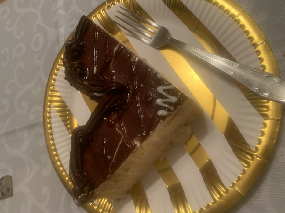 - "A heart-shaped slice of cake, covered in dark chocolate ganache with a white zigzag decoration, rests on a disposable paper plate" by FM-Etrm53, licensed under CC BY 4.0