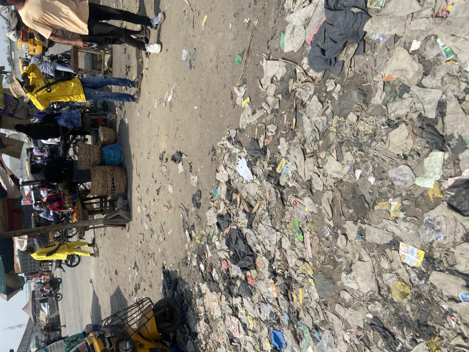 The image depicts an unpaved outdoor market area in Alasia, Nigeria, under a bright, hazy sky. The foreground is dominated by a dense, heterogeneous accumulation of refuse, consisting primarily of discarded plastic bags, paper, fabric scraps, and general debris, covering the packed dirt ground. Partially visible on the far left is the front wheel and metal cargo rack of a yellow commercial tricycle. In the midground, several market activities unfold. A wooden stall table displays various items, possibly produce like oranges, next to three woven baskets, one lined with a blue plastic bag. A vendor in dark clothing attends this stall under a striped market umbrella. Two male individuals stand centrally: one in a bright yellow long-sleeved shirt, ripped blue jeans, and a plaid bucket hat is depicted adjusting his hat with both hands; another in a light peach t-shirt and dark pants stands nearby, facing slightly right. The background reveals a paved road with vehicular traffic, including multiple motorcycles and at least one additional yellow commercial tricycle. More pedestrians and market stalls are visible further down the street. An elevated concrete structure, possibly an overpass, is discernable on the distant left horizon. The overall environment is characterized by open-air commerce, visible waste management issues, and ongoing daily activity.