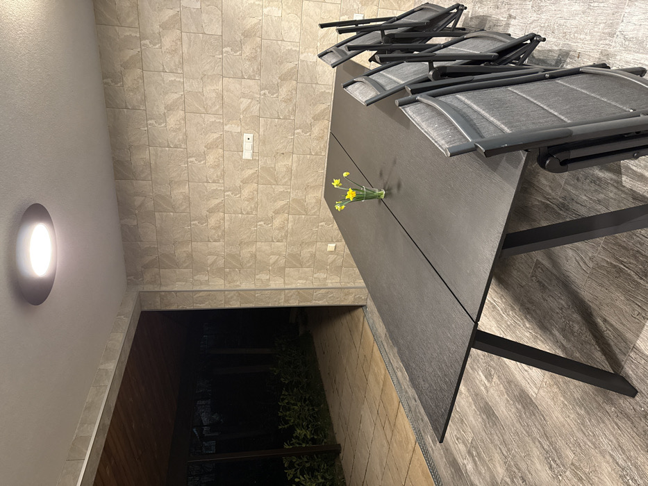 The image depicts a covered outdoor dining area, likely a veranda or patio, in Peyovstsi, Bulgaria, illuminated at night. A circular, flush-mounted LED light fixture on the white ceiling provides primary illumination. The right wall is covered in light-beige, rectangular, rough-textured tiles, with a white electrical outlet and switch panel positioned centrally. The floor is tiled with elongated planks resembling dark grey-brown wood grain. A long, rectangular outdoor dining table, dark grey with a textured surface and dark angled legs, occupies the center-right of the frame. Four dark grey metal-framed folding chairs with mesh seats and backs are positioned along the right side of the table, appearing stacked or partially folded. A small, clear glass vase containing three yellow daffodils sits on the table, slightly to the left of its center line. To the left, a large open entryway leads to a dimly lit exterior. The outdoor area features light-colored square paving stones and dark green low-lying vegetation. A darker wooden or metal structure is partially visible in the distant background. No individuals or active interactions are present within the scene.
