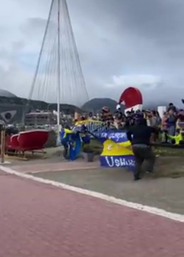 In a public plaza adorned with Christmas decorations, a group of people enthusiastically wave a large banner displaying blue and yellow colors, while one person plays a drum. The banner reads, "En la esquina De mi Barrio, Ushuaia," which translates to "On the corner of my neighborhood, Ushuaia." The sky is overcast, and in the background, there is a snow-covered mountain range. Prominent decorations include a large, light-covered Christmas tree frame and a red Santa hat statue. The plaza has a brick-paved walkway and grassy areas with additional decorations. The overall atmosphere suggests a festive gathering with a sense of community pride.