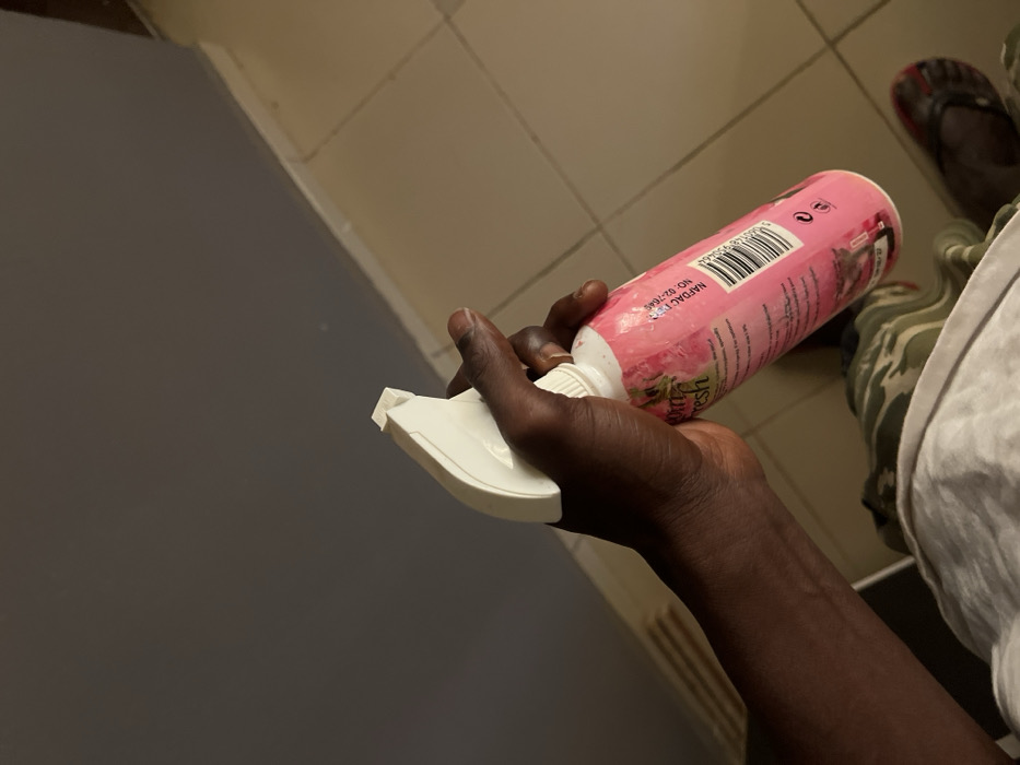 A dark-skinned hand holds a pink spray bottle with a white nozzle