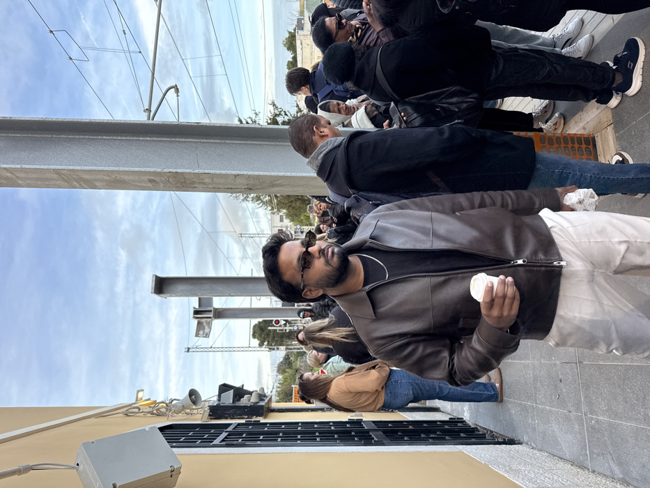 The scene depicts a diverse group of individuals gathered on a railway platform at the Alberobello train station in Alberobello, Italy, under an overcast sky. In the foreground, a man of South Asian descent stands facing slightly left, wearing dark rectangular sunglasses, a dark brown zippered leather jacket, a black t-shirt, a silver chain, and light-colored trousers. He holds a white disposable cup in his right hand and a crumpled white item in his left hand. To his left, a pale yellow building wall with a dark grated window or door is visible. A grey electrical box and a white speaker are mounted high on this wall. To his right and behind him, a crowd of approximately a dozen adults is standing. They are dressed in various casual attire, including jackets and jeans, appearing to wait. Some individuals in the crowd wear backpacks. The background features railway infrastructure, including prominent grey structural steel beams supporting overhead electrical lines (catenary system). Further back, railway tracks are partially visible, along with a red signal light and sparse green foliage. The platform surface is paved with light grey tiles.