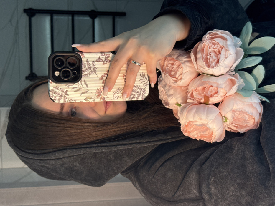 A female individual is depicted taking a mirror selfie in a domestic setting within the city of Tliustenkhabl', Russia. She is partially visible, with her face mostly obscured by a light-colored smartphone featuring a botanical pattern case, held in her left hand. Her right eye and the right side of her face are visible, along with her long, dark brown hair. She is wearing a dark gray, faded hooded sweatshirt. Her left hand displays manicured nails with light polish and a ring on the ring finger. In her right arm, she holds a bouquet of approximately six light pink, artificial peonies with green artificial leaves. The background, reflected in the mirror, shows a light-colored tiled wall and a black, wall-mounted heated towel rack.