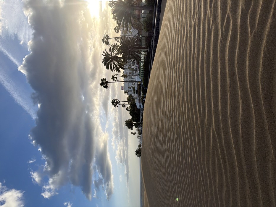 The image depicts a desert landscape bordering a developed area, located in San Bartolomé de Tirajana, Spain. In the foreground, extensive sand dunes exhibit distinct, parallel ripple patterns, indicating wind erosion. The sand is light brown with shadows highlighting the undulating texture. A small, bright green, spherical object rests on the sand in the lower left quadrant. The midground and background on the right feature a resort complex comprising several white buildings, identifiable as hotels, with one displaying a visible "RIU" logo. Numerous tall palm trees are interspersed throughout the hotel grounds and along the perimeter, providing a tropical canopy. A dark-colored paved area or walkway separates the sand dunes from the hotel property. The sky is partially cloudy, with large grey clouds concentrated in the upper center and right, while patches of blue sky are visible on the left. The sun is low on the right horizon, casting a bright golden light and generating a lens flare. Two faint contrails are visible in the upper left blue sky. No individuals are clearly discernible within the frame performing specific actions.