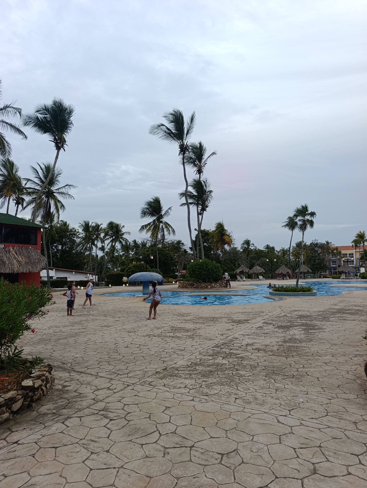 The image depicts an outdoor scene at a resort in an unknown location. The foreground is dominated by a wide, paved area with a textured, irregular stone pattern. In the middle ground, there is a large, irregularly shaped swimming pool with several people in and around it. Palm trees surround the pool area, and there are several thatched-roof structures, possibly cabanas, in the background. In the distance, there are buildings. There are four children near the pool. One is wearing a white shirt and dark shorts, another a white t-shirt and blue shorts, and a third a dark one-piece bathing suit. It looks like they are playing with a ball.