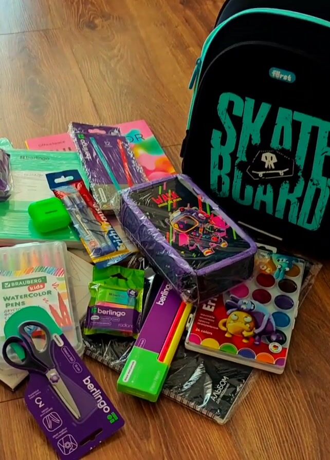 black backpack with a teal "SKATE BOARD" design next to a pile of school supplies on a wooden floor. The supplies include pens, pencils, watercolors, notebooks, rulers, scissors, glue, and other stationery items, many of which are labeled "Berlingo." The backpack is positioned to the right of the scattered supplies.