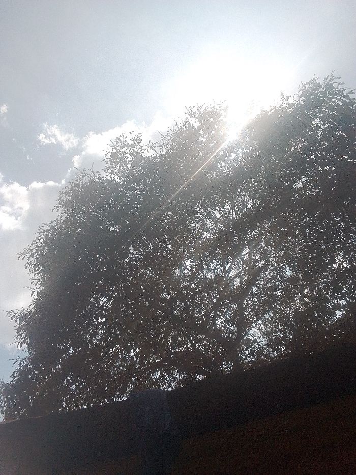 The image displays an outdoor scene in Ngong ward, Kenya, captured from a low angle. The upper portion of the frame is dominated by a bright, partially cloudy sky, with the sun prominently visible in the upper right quadrant. Strong solar rays and lens flare emanate from the sun, illuminating the scene. A large, dense-canopied tree is silhouetted against the bright sky and sun, occupying the central and left areas of the image. The tree's foliage appears dark due to backlighting. The bottom approximately one-quarter of the frame shows a dark, indistinct, horizontal structure, possibly a wall or roofline. No individuals, animals, or specific actions are discernible.