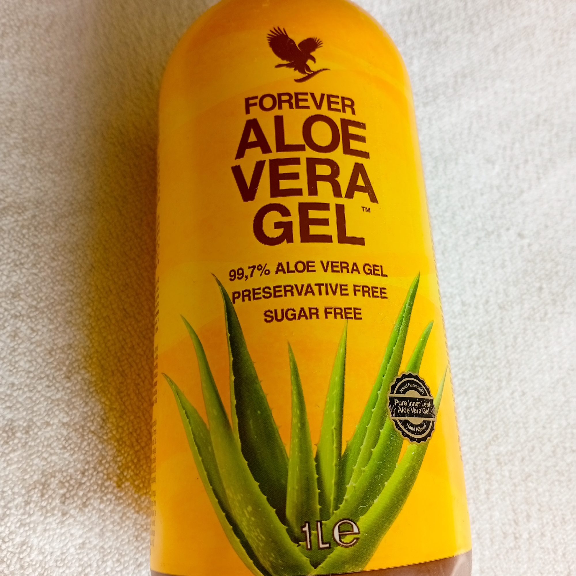 - "The scene displays a yellow plastic bottle of "FOREVER ALOE VERA GEL™" resting on a light-colored, textured fabric surface in the city of Harmanli, Bulgaria" by FM-tIMEp2, licensed under CC BY 4.0