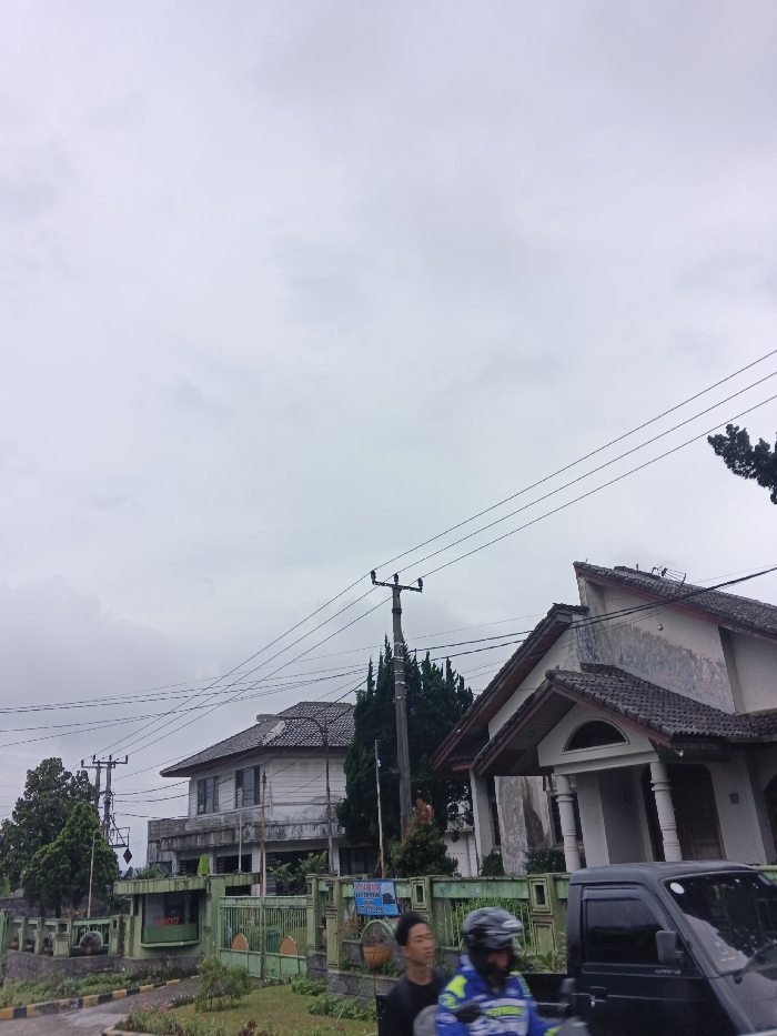 This image depicts a street scene reportedly located in Шчыткавіцкі сельскі Савет, Belarus. The sky is uniformly overcast and light grey. In the foreground, a dark grey paved surface, possibly a road or shoulder, is visible on the lower left, partially obscuring a yellow painted line. Adjacent to this, green ground cover and small plants are present. On the lower right, two males are partially visible. The left individual has short dark hair and wears a dark top, looking towards the left. The right individual wears a grey full-face helmet and a blue, black, and white patterned jacket, appearing to be on a motorcycle or in a dark-colored pickup truck, a portion of which is visible on the far right. The midground features a green metal fence with decorative elements, including circular motifs on a gate-like section to the right. Behind the fence, two prominent buildings are visible. The building on the left is a multi-story structure with a grey tiled roof, showing significant staining and peeling paint on its light-colored walls. It has multiple dark-framed windows. A lower section of this building, behind the fence, displays a partially obscured red sign. Between this building and the one on the right, a tall, dark utility pole supports numerous black electrical and communication wires that crisscross the upper frame. The building on the right is a house with a brown tiled, gabled roof. Its light-colored facade exhibits weathering similar to the left building, and it features an arched entrance with two classical columns. An antenna is visible on its roof. Various forms of vegetation populate the scene, including tall, dark green coniferous trees behind and between the buildings, as well as smaller bushes and ornamental plants within the fenced properties.