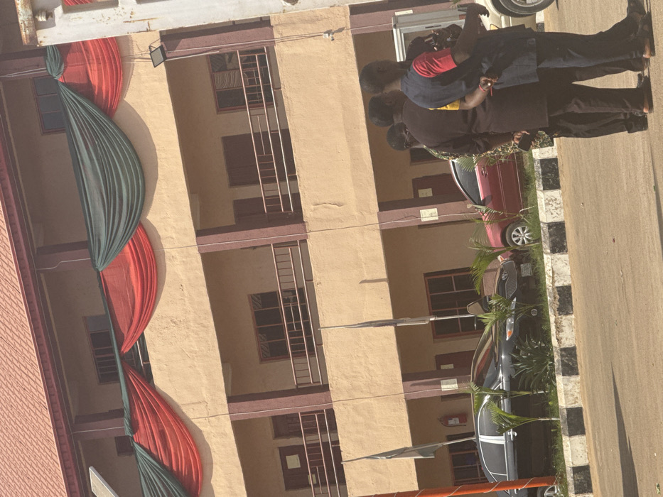The scene depicts the exterior of a three-story building in Sabon Tasha, Nigeria, under bright daylight