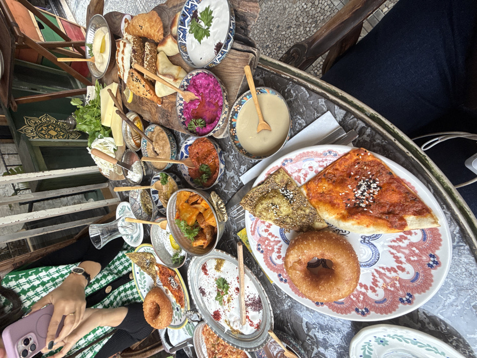 The image depicts an outdoor or semi-outdoor breakfast or brunch setting at a cafe in Beyoğlu, Turkey