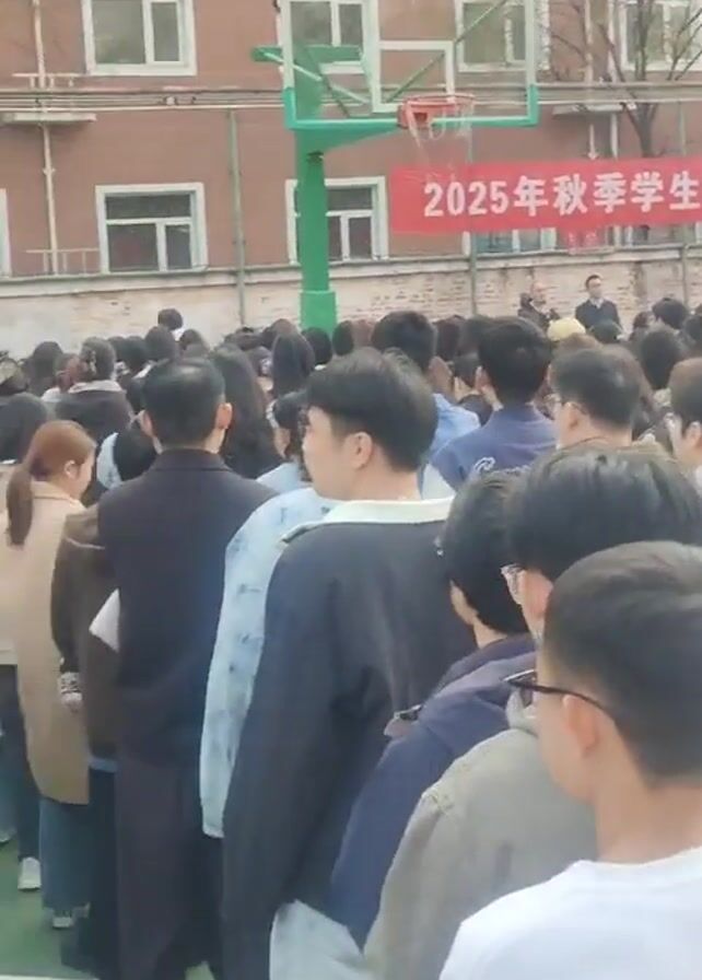 A crowd of people stand outdoors in front of a brick building with white-framed windows. A red banner hangs on the building, reading "2025年秋季学生宿舍楼消防防逃生疏散", which translates to "2025 Autumn Semester Student Dormitory Fire Prevention Escape Evacuation." The crowd consists of people of various ages and ethnicities, some wearing backpacks or carrying items. Some individuals wear distinctive clothing, like a blue hoodie or a light-colored puffer vest. A basketball hoop is visible beside the banner. Some people in yellow hardhats are scattered in the group, and in the distance, a taller building is visible. The camera moves slightly, showing more of the crowd and their attire.