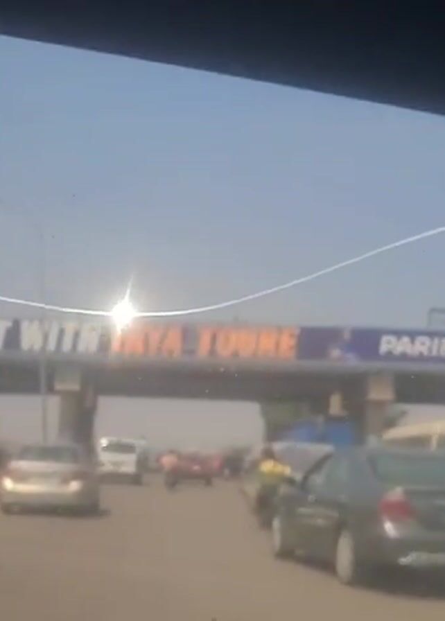 car driving on a highway under a bridge with a large banner advertising "PARIPESA" and featuring the soccer player Yaya Touré. The traffic is moderate, with cars, trucks, and motorcycles moving in both directions. There are pedestrians on the side of the road. The sky is clear and sunny. The shot is taken from inside the car, showing the windshield. The car is moving forward.