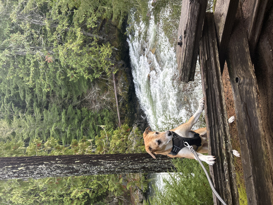 A dog wearing a black harness stands next to a weathered wooden fence. The dog has tan fur and is leashed. Beyond the fence, a rapidly flowing river or stream rushes through a forested area. Lush green trees line the banks of the river. The photograph is oriented in a rotated perspective.