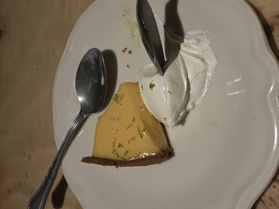 A top-down view reveals a partially eaten dessert on a white plate. A slice of key lime pie sits next to a dollop of white cream. A metal spoon rests to the left of the pie, while another metal utensil is plunged into the cream. Small green zest is sprinkled atop the pie and cream. The plate has a decorative scalloped edge and rests on a wooden surface.