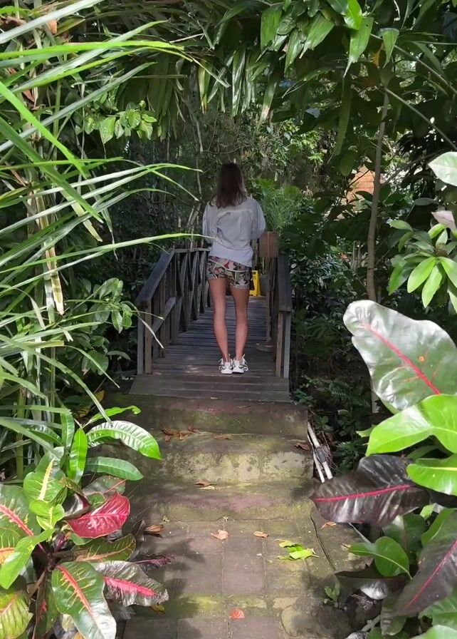 A woman is walking across a wooden bridge in a lush, tropical environment. The camera follows her from behind as she walks up a short set of stone steps leading to the bridge. She is wearing a white shirt, colorful patterned shorts, and white sneakers. She carries a box in her left arm. The bridge is surrounded by dense greenery, including various plants with green and red leaves. The path leading to the bridge is made of stone and covered with leaves. The lighting is natural and filtered through the trees, creating a slightly shaded atmosphere. The woman pauses on the bridge. The environment is dense with natural foliage and trees that stretch upwards and frame the scene.