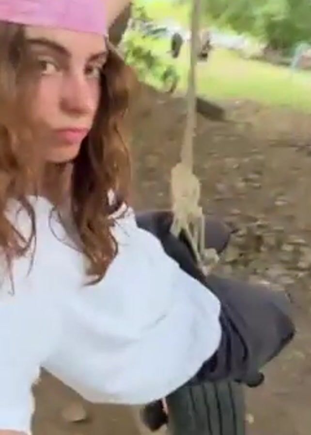 A person with long, curly brown hair wearing a pink bandana, a white long-sleeved shirt, and black pants is on a tire swing