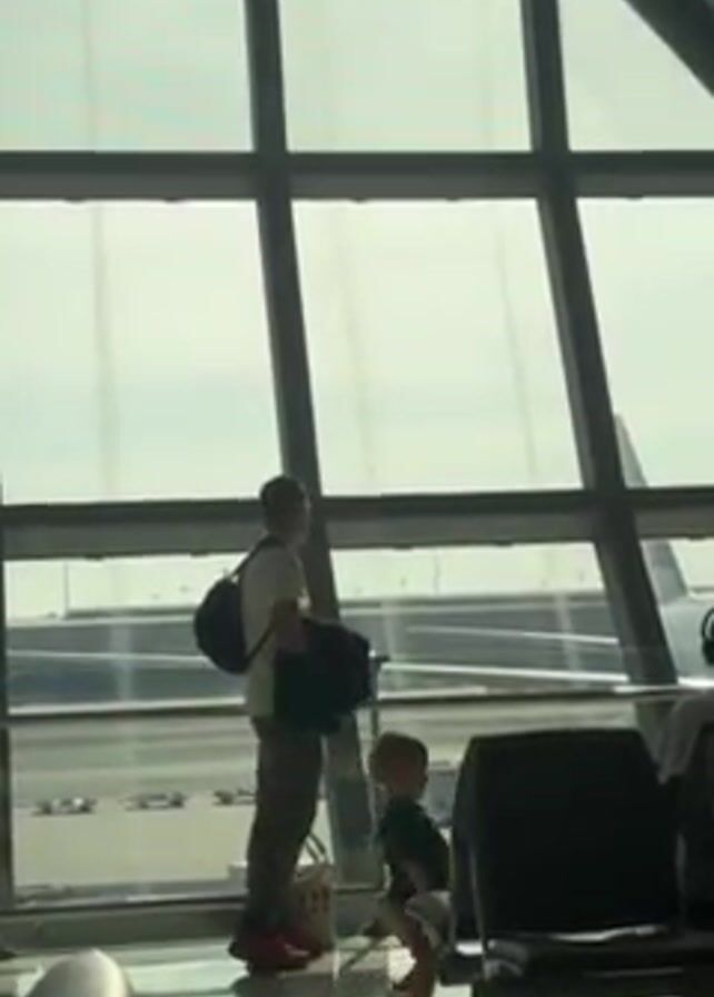 man and a small child standing by a large window at an airport
