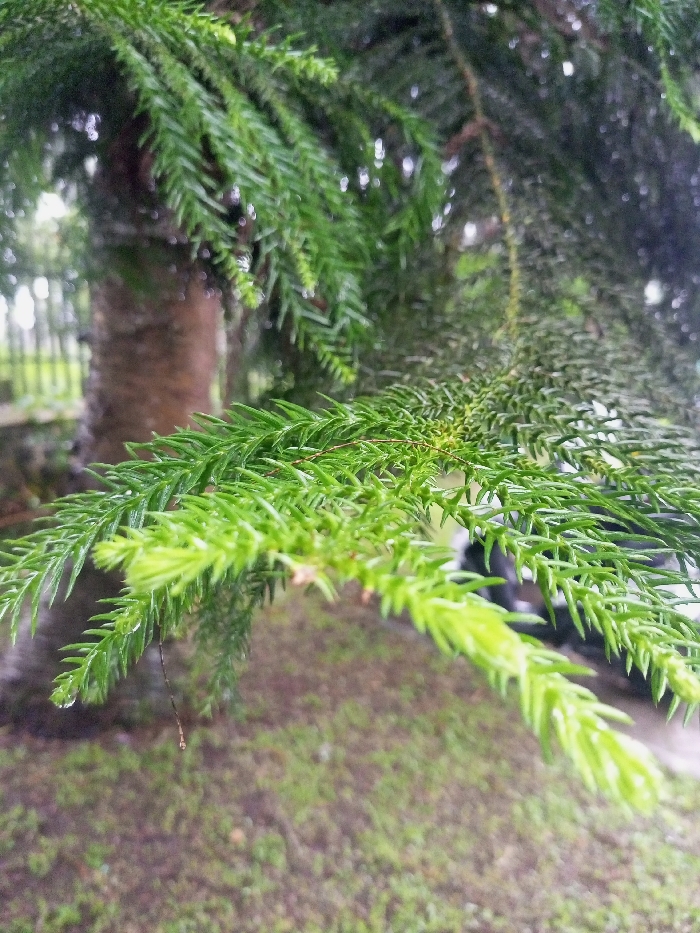 - "The image displays a close-up, downward-angled view of the wet, green foliage of a coniferous tree, likely a Norfolk Island Pine, located in Beni, Nepal" by FM-Xhjgf1, licensed under CC BY 4.0